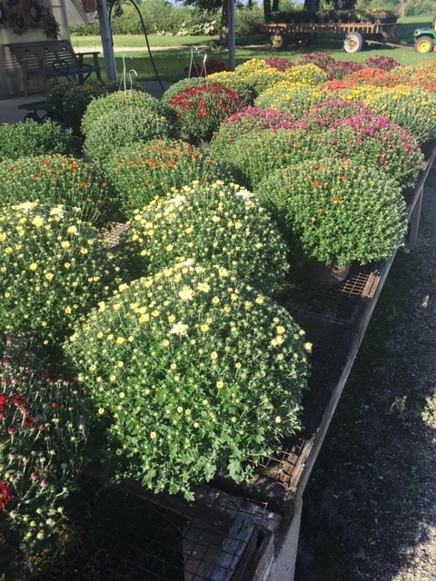 It is officially mum time! We grow over 6000 mums for fall in multiple colors and sizes-4"pot, 9" pot, jumbo 14" pot and hanging baskets. We've also got flowering kale and pumpkins and gourds will be ready about mid September. Stop by and see us Monday-Friday 9 to 5 and Saturday 9 to 4!